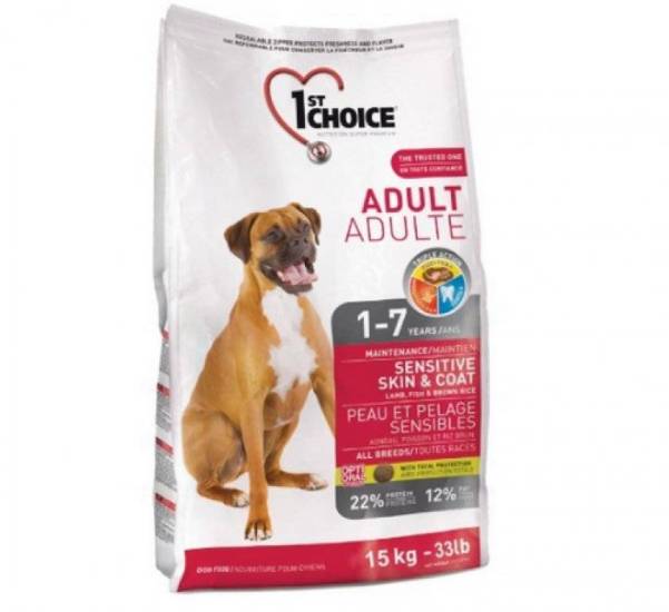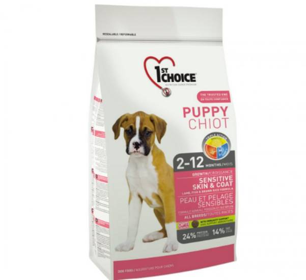 В линейке представлен и корм 1st choice для щенков всех пород, страдающих чувствительностью шерсти и кожи. Источниками протеинов выступают мясо ягненка и рыба, дополненные витаминами, кальцием и минеральными веществами.