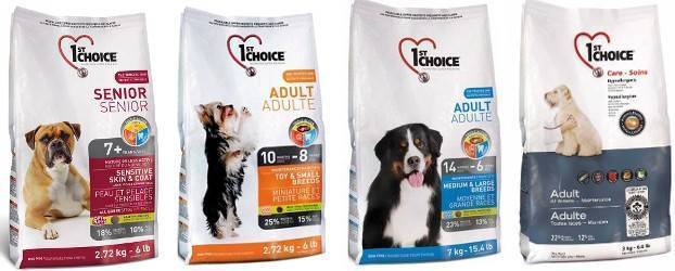 Линия кормов для собак 1st choice была создана с учетом различных пищевых потребностей животных, которые зависят от их возраста, состояния шерсти, характера и условий жизни. В ассортимент входят корма для щенков, взрослых собак и пожилых питомцев.