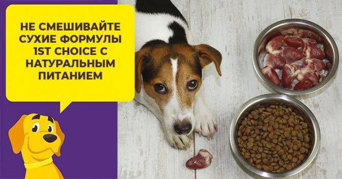 Не смешивайте сухие формулы 1st Choice с натуральным питанием. Это может привести к гастриту, расстройству кишечника, другим нежелательным проблемам с пищеварением.