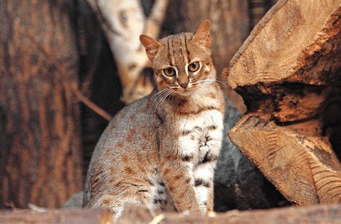 Самой миниатюрной представительницей диких кошачьих является ржавая или пятнистая кошка. Выражение растерянности проявляется на ее мордочке из-за оттопыренных маленьких ушей и больших глаз. Однако это обманчивое чувство, так как эта малютка отлично чувствует себя в дикой среде и прекрасно охотится. Приятные шерсть и голос, свойственные больше домашним котятам, отличают ее от других представителей дикой фауны. Ее окрас похож на расцветку бенгальской кошки, но не такой яркий. Взрослые самцы весят не больше 1,6 кг.