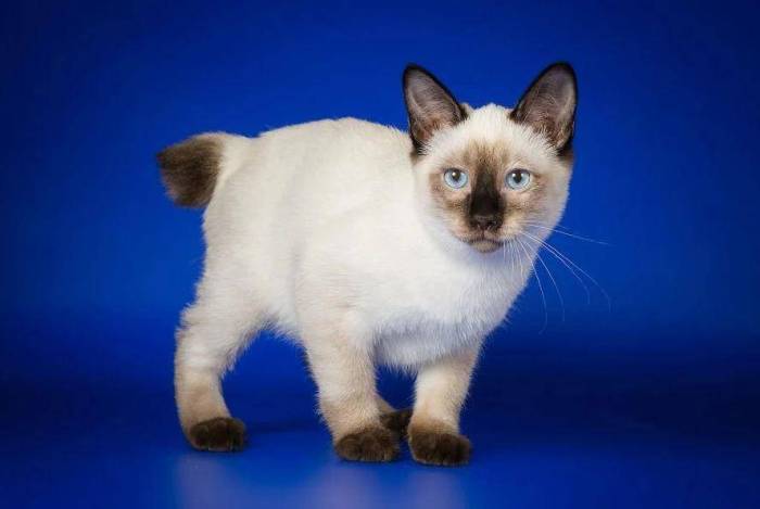 Миниатюрные размеры животных — результат рецессивной мутации. Внешне порода напоминает сиамскую кошку — окрас колор-пойнт, большие голубые или синие глаза. Вот только хвостик у них небольшой, как у бобтейлов, напоминает помпон или кисточку.