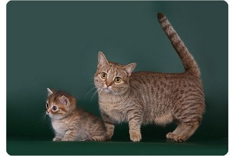Знаменитые манчкины, кошки-малышки, возникли благодаря естественной мутации в США, Великобритании и даже России. Эти короткошерстные создания имеют вытянутое тело и короткие лапки, что делает их похожими на такс. Кроме того, они напоминают кенгуру, так как любят сидеть на задних лапках и осматривать окружающее пространство. Название породы происходит от маленького волшебного народа из книги «Волшебник страны Оз», которых автор назвал манчкинами. Вес самых маленьких самцов составляет 2,7 кг, а самок – 1,8 кг.