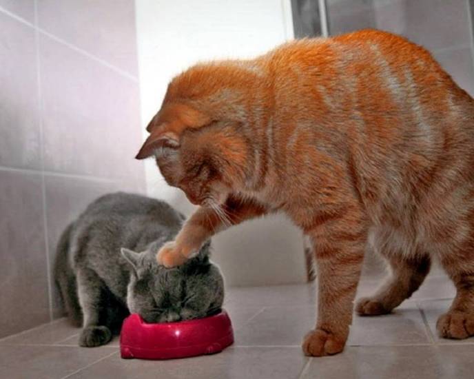Этот тип агрессии биологически детерминирован. В этом случае за агрессию ответственны гормоны. Их влияние на поведение кошки проявляется в готовности бороться за еду. Это очень естественное поведение животных, но не обязательно желаемое владельцами кошек.