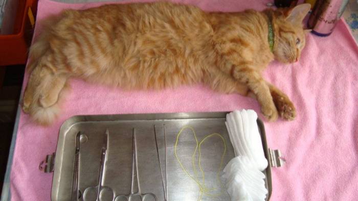 Чтобы кошка не расцарапала себя в послеоперационном стрессе, важно обрезать ей когти. За полдня до операции показано обильное питьё и запрещена еда