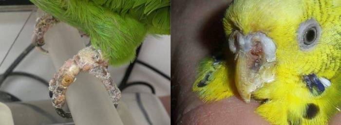 болезнь волнистых попугаев, приводящая к поражению кожи восковицы, клюва, лап и клоаки. Паразиты могут попасть к домашнему питомцу вместе с некачественным кормом, необработанными аксессуарами для клетки или зараженными ветками растений. Появляющиеся наросты серо-желтого цвета причиняют птице зуд и ужасный дискомфорт, и в особо запущенных случаях заболевание приводит к смерти питомца. Для лечения волнистого попугая используются различные ветеринарные препараты, которые должен подобрать орнитолог, а также проводят обработку клетки средствами Неостомозан, Бутокс или Экоцид С;