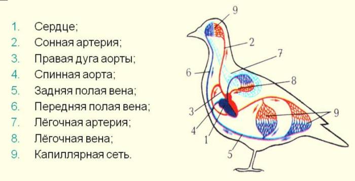 Для птиц, которые летают, характерны внушительные размеры сердца. Это связано с тем, что обмен веществ происходит в быстром темпе, а на полет требуется много энергии. Кровяная система состоит из следующих органов:
