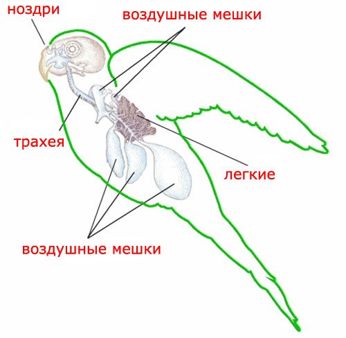 Дыхательная система волнистого попугая включает две пары «воздушных мешков». При вдохе воздух проходит через легкие в воздушные мешки шеи и головы, а при выдохе воздух из брюшных мешков возвращается в легкие. Это обеспечивает постоянное обогащение организма кислородом.
