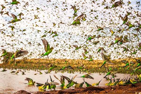Благодаря своему зеленому, травянистому окрасу, волнистые попугаи отлично маскируются среди листвы. Их рацион состоит из семян диких трав, стеблей и ягод.