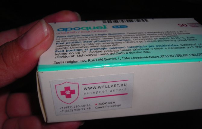 Диагноз пищевая аллергия, дифференцированный диагноз – атопический дерматит. Ветеринарный врач порекомендовал нам препарат Апоквел в дозировке по 16 мг 2 раза в день.