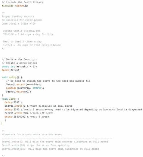 Теперь наступает самая весёлая часть. Нам нужно запрограммировать Ардуино так, чтобы он выдавал еду в определенное время суток. Я постарался сделать код максимально простым. Основываясь на возрасте, весе и породе, я посмотрел, как много и как часто Дюку нужно есть в течение дня, чтобы быть сытым. Автоматическая кормилка была настроена на 0.65 чашки каждые 8 часов. Время и количество еды можно легко модифицировать в зависимости от потребности вашего домашнего животного. Распиновка останется прежней.