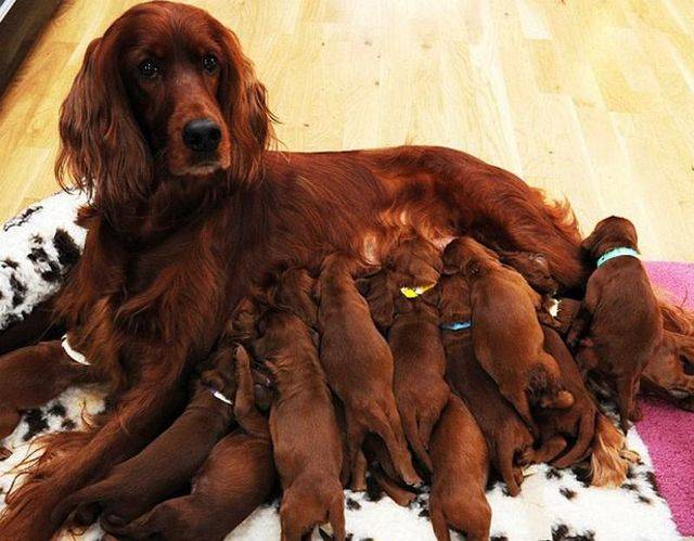 С 51 по 58 день происходит подготовка к родам, сука большую часть времени отдыхает и вылизывает живот. Из сосков могут выделяться капли молозива. Обязательно измерять ректальную температуру, чтобы определить приближение родов.