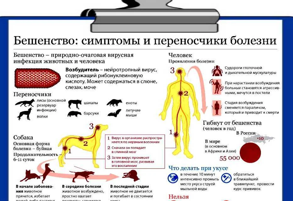 Симптомы бешенства: Первые признаки заболевания могут проявляться через 1-3 месяца после укуса, но в некоторых случаях инкубационный период может длиться до года. Симптомы включают изменения в поведении, агрессивность, гиперактивность, а также физические проявления, такие как паралич и трудности с глотанием. Одним из характерных признаков бешенства является “пена у рта”, вызванная спазмами мышц глотки.