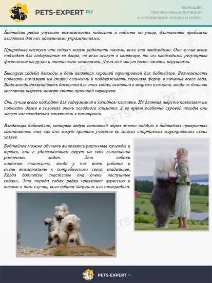 Бобтейлы, отличающиеся своей энергией и подвижностью, нуждаются в продолжительных прогулках (не менее часа) каждый день, как утром, так и вечером. Это необходимо для того, чтобы они могли выпустить накопившуюся энергию. Староанглийские овчарки с радостью составят компанию в пеших прогулках, утренних пробежках, велопрогулках и других активных занятиях.