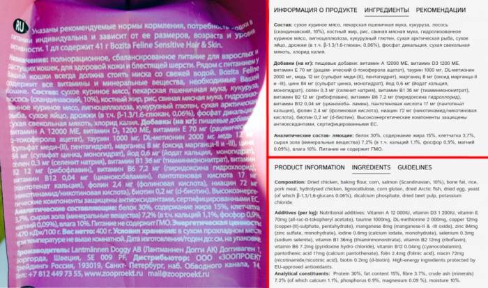 Ознакомимся с составов корма Bozita на примере варианта Sensitive Hair & Skin (сухой корм для взрослых длинношерстных кошек и кошек с чувствительным пищеварением). Посмотреть его можно на изображении ниже (кликните по изображении чтобы увеличить его для удобности чтения):