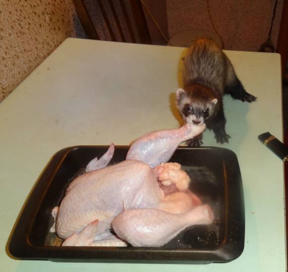 Если же нет возможности регулярно обеспечивать хорька живой пищей, можно использовать другие натуральные мясные продукты. Наилучшим выбором будет мясо домашней птицы – курятина, индюшатина или утятина. Мясо птицы содержит важную для хорьков аминокислоту таурин, которая способствует нормальному функционированию сердца, печени и активной работе мозга. Кроме птичьего мяса, хорькам можно иногда предлагать телятину или баранину, а также потроха – сердце, печень, почки и другие. Все мясные продукты лучше всего давать в сыром виде. Рыбу можно вводить в рацион в небольших количествах, чтобы обеспечить организм хорька необходимыми элементами.