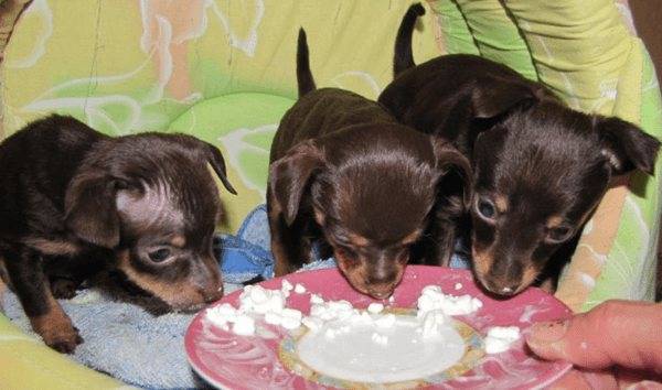 В течение первых трех недель жизни щенок получает исключительно материнское молоко, после чего можно постепенно начинать вводить прикорм, состоящий из теплого коровьего или козьего молока.