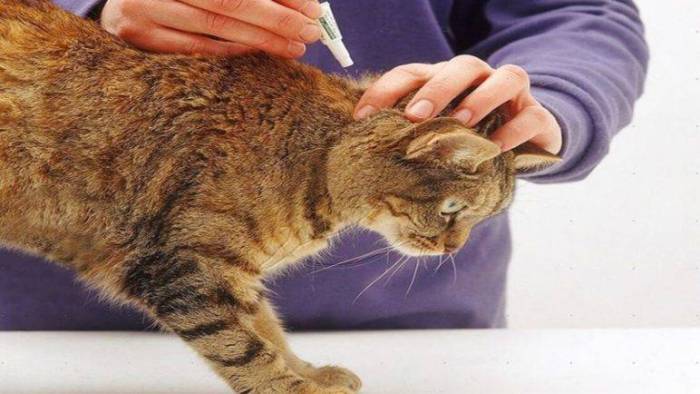 Лечение ушной чесотки у кошек включает применение специальных капель, которые закапываются в наружный слуховой проход после предварительной гигиенической обработки.