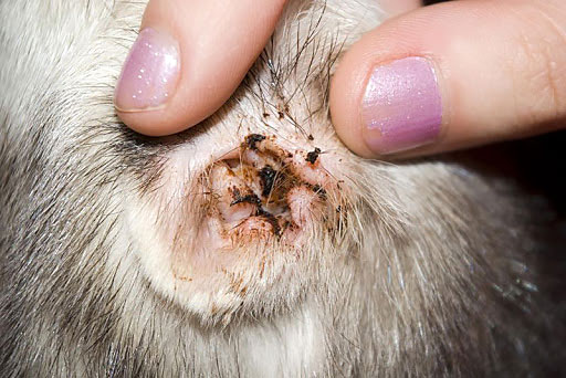 - Повреждение кожного покрова : ушные клещи прогрызают ходы в верхних слоях кожи, чтобы добыть пищу или отложить яйца. Обычно это сопровождается сильным зудом, и животное стремится расчесать уши лапой или потереться о дверные косяки или мебель. Однако в некоторых случаях первый этап протекает бессимптомно.