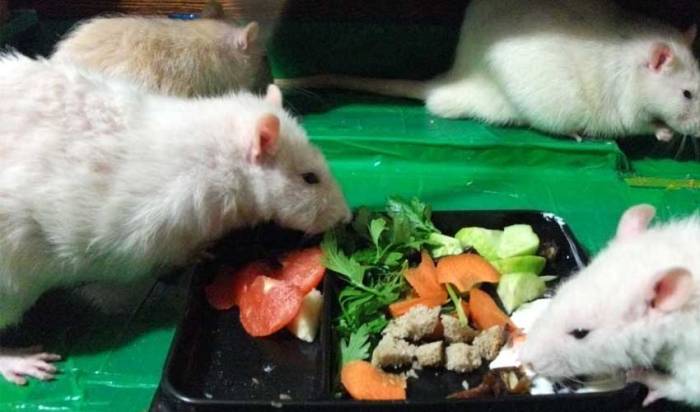 Овощи, фрукты, зелень: свекла, репа, морковь, топинамбур, кабачки, томаты, огурцы, листья салата, свекольная ботва, листья подорожника, одуванчиков, клевера. Давать растительный прикорм нужно каждый день или через день из расчета 10–15 г на взрослую крысу в сутки. Животный белок: мясо, рыба, яйца.