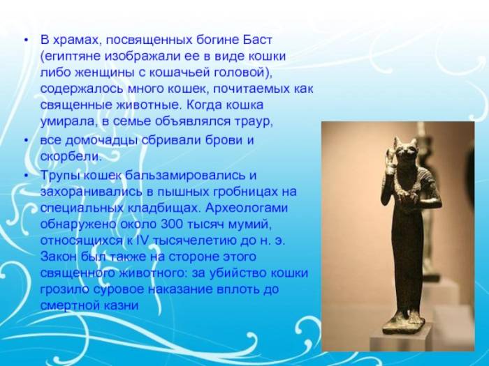 охоты Артемиде, несколько схожей с египетской Баст. Отчасти функции Баст присущи и римской богине любви Венере, которая иногда изображалась вместе с кошкой (вероятно, полудикой).