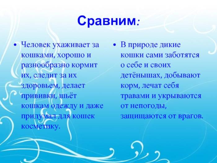 Слайд 15Сравним:Человек ухаживает за кошками, хорошо и разнообразно кормит их, следит