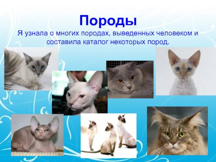 Слайд 10Породы Я узнала о многих породах, выведенных человеком и составила каталог