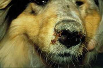 - Кожная форма – одна из самых благоприятных по течению и прогнозу форм чумы плотоядных. На коже питомца появляется характерная сыпь, которая может перерастать в язвы. Язвы образуются на передних и задних лапах, особенно на подушечках. Часто страдают ушные раковины.