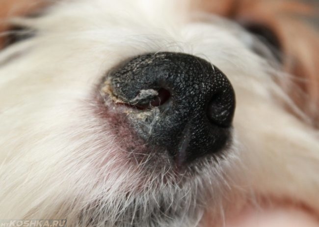 - На слизистых носа и на внешней поверхности видны трещинки, покрытие корками.