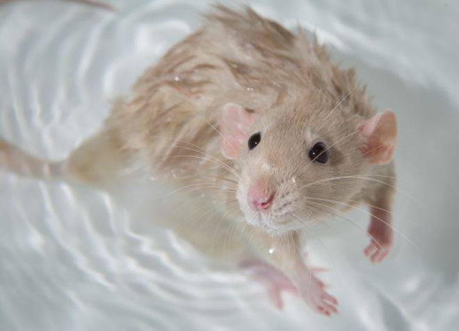 Кроме уборки помещения, советуется иногда купать крысу. Грызуны не боятся воды, поэтому проблем с процедурой не будет. Наберите в ванну теплой воды ровно столько, чтобы она касалась животика стоящей в ней крысы. Позвольте питомцу поплавать, после чего промокните шерстку полотенцем.