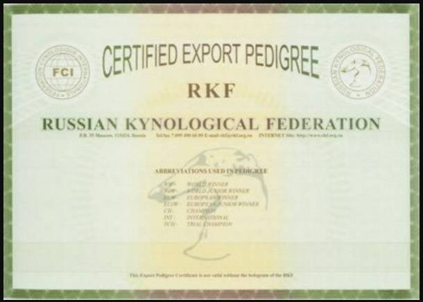 Дополнительная информация. Для участия в международных выставках, независимо от их местоположения, необходима экспортная родословная. На собаку, привезенную из-за границы, должно быть оформлено внутреннее свидетельство.