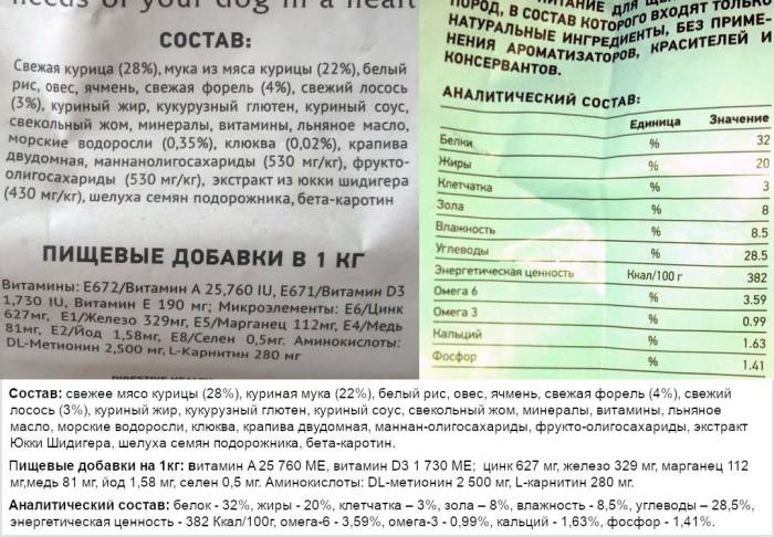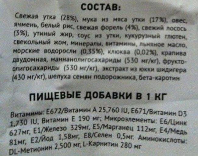Под первым номером здесь 28% курицы, имеется в виду свежее мясо, которое в процессе приготовления утратит воду, а значит, этот показатель в готовом корме значительно снизится. Из этого можно смело делать выводы, что красноречивое заявление производителя представляет собой не что иное, как рекламный ход. Та же участь постигнет и форель с лососем, в итоге и без того небольшое количество окажется вообще несущественным.
