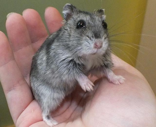 Джунгарский хомяк принадлежит к наиболее известным питомцам маленьких пород. Обитает грызун и в дикой природе: на азиатских степных равнинах и в пустынях. Представители этого вида очень контактные и неравнодушные к вниманию. Джунгарик, как его ещё называют, имеет густую серую шёрстку с тёмной полоской по всей длине спинки, и беленький животик. Весят хомячки всего 35–60 граммов при размерах 5–10 см.