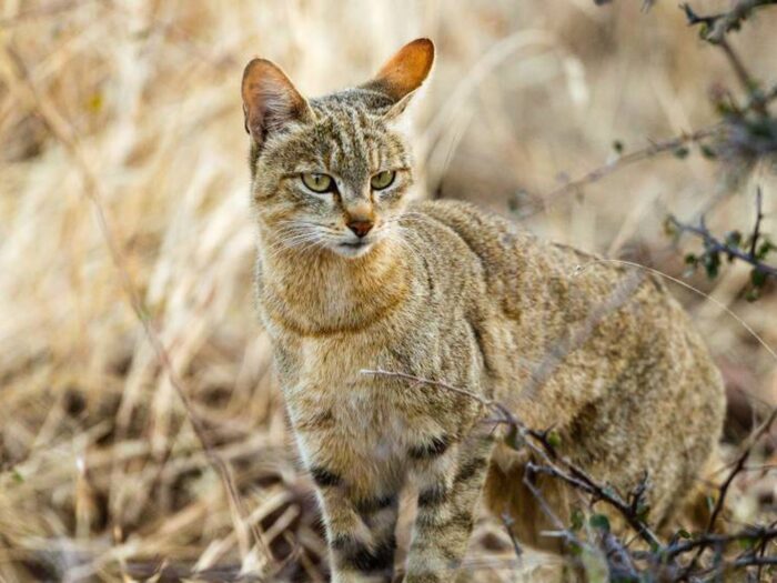 Пучки или кисточки на ушах показывают их дикое происхождение. Его шерсть короткая и очень густая. Окрас может варьироваться от серого до пепельно-желтого. На задней части его тела видны темные пятна или полоски, которые заканчиваются длинным хвостом с черным кончиком. Это крупные кошки, так как их вес может достигать 7 кг. Они независимы и очень территориальны. Охотничий инстинкт до сих пор глубоко укоренился в них.