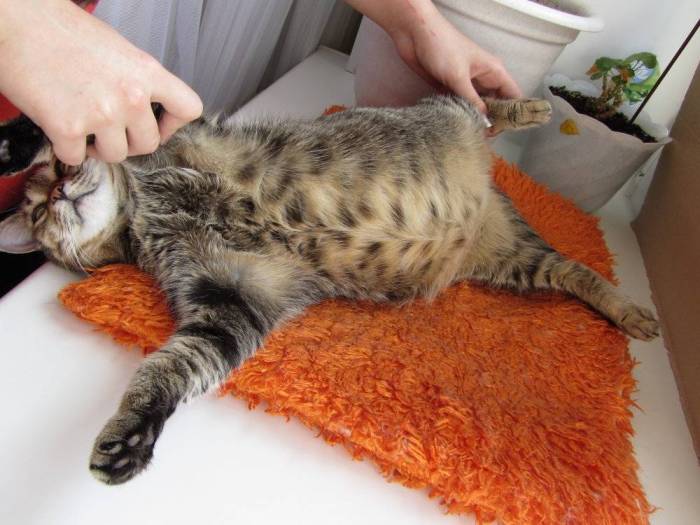 - Живот больного кота становится вздутым и издает бурчание. Животное не позволяет к себе прикоснуться, жалобно мяукает, сутулится, опускает уши и шипит на людей — все это указывает на то, что питомец испытывает дискомфорт.