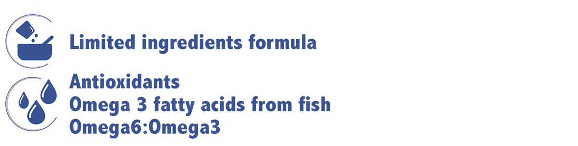 В начале списка находятся рыбная мука или переработанные белки (например, из оленины, баранины, свинины или конины). Общее содержание белка в кормах достигает 30%. На втором месте располагаются углеводы, представленные цельным горохом, рисом, гороховым крахмалом или картофелем. Затем следует куриный или рыбий жир, который служит источником жиров и жирных кислот. Мейтаке — это съедобный гриб, способствующий укреплению иммунной системы. Юкка Шидигера применяется для снижения неприятного запаха экскрементов. Остальные ингредиенты аналогичны тем, что были упомянуты в предыдущей линейке корма и описаны ранее.