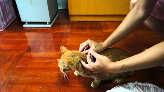Чтобы нанести капли, отломайте кончик у пипетки. Шерсть раздвигается руками, лекарство наносится между лопатками, втирать его не нужно. В процессе нанесения лекарства удерживайте кошку, чтобы раствор попал именно на кожу. Если используется спрей Фронтлайн, животное купать предварительно не надо. В буклете указана вся информация по необходимой дозировке.