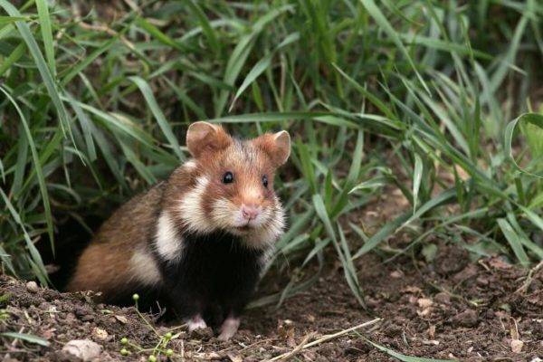 Хомяк обыкновенный – это довольно крупное животное, длина его тела может достигать тридцати четырех сантиметров. Этот вид предпочитает обитать в степных районах и часто селится вблизи человеческих поселений. Его внешний вид отличается яркой окраской и длинным хвостом. Спина хомяка имеет рыже-коричневый оттенок, по бокам расположены белые пятнышки, а брюшко окрашено в черный цвет. В дикой природе хомяки живут около четырех лет, в то время как в условиях неволи их жизнь может продлиться до шести лет.