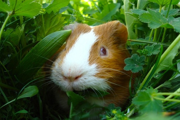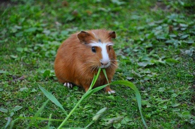 Свинка лакомиться сочным стебельком травы