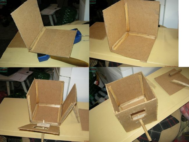 - Крышка. Желательно делать ее откидывающейся или съемной, что упрощает процесс очищения конструкции. Дополнительно появляется возможность периодически заглядывать внутрь, чтобы проверить птенцов.