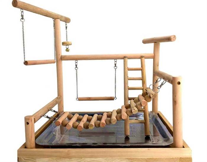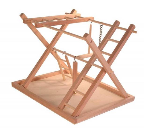 - Для основы нужно выбирать материал природного происхождения – древесину безопасных пород. Используя доступные приспособления, можно сделать площадку для попугая своими руками. Карабкаясь по деревянным рейкам, веткам и дощечкам, птица будет стачивать когти, клюв. Изделие с преобладанием металла или пластика менее предпочтительно.