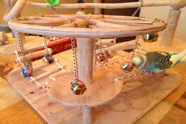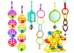 Наиболее популярной игрушкой для попугаев является колокольчик. Также не теряют актуальности зеркала, качели, лестницы и обручи. Некоторые владельцы даже покупают карусели. Для менее изобретательных и осторожных подойдет простая нитка с нанизанными на нее бусинами. Чем больше бусины, тем интереснее будет игра!