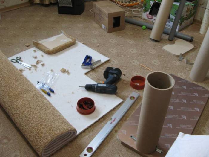 Материалы. Для основы принято брать листы ДСП, с ними удобно и легко работать, к тому же они стоят относительно дешево. Что касается отделки, то тут в ход может пойти все, что есть у вас дома: обрезки ковролина, различная ткань, джутовая или просто бельевая веревка. Старайтесь выбирать натуральные материалы, поскольку домашние питомцы склонны к аллергическим реакциям.