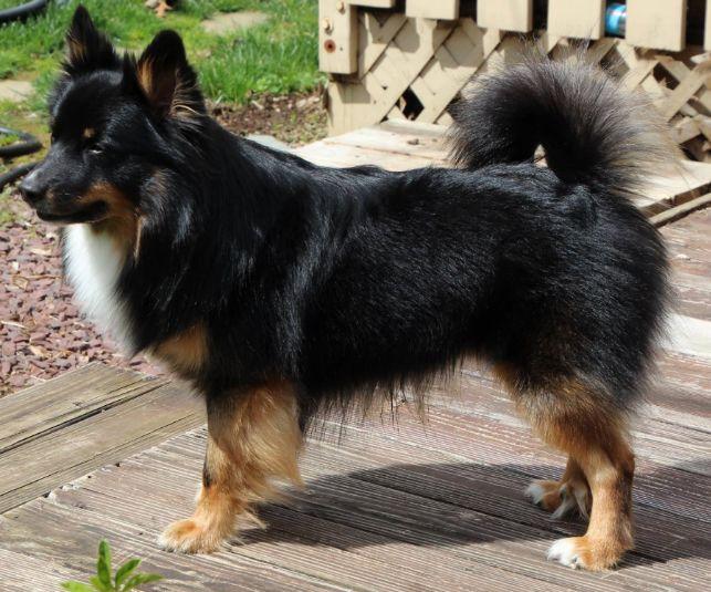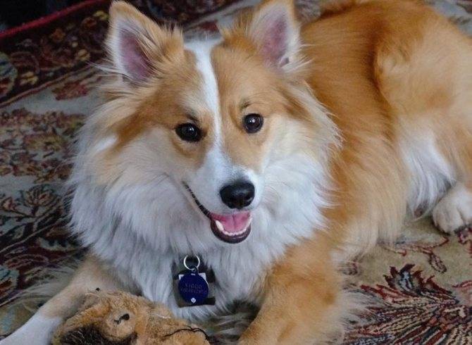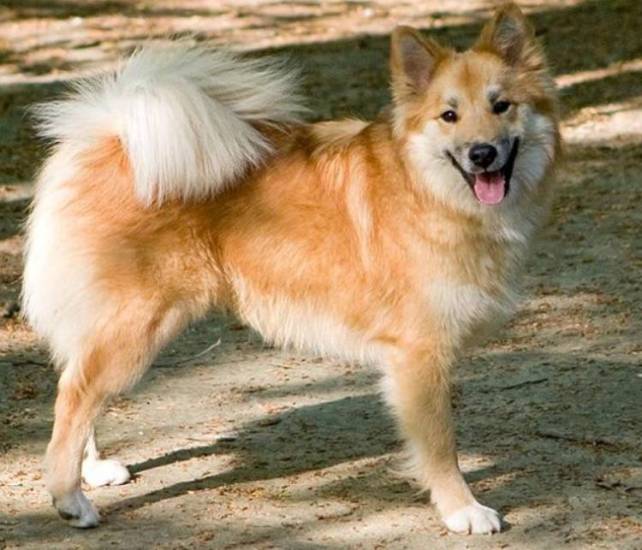 Исландская овчарка с закрученным пушистым хвостом и стоячими ушами — это истинный представитель породы.