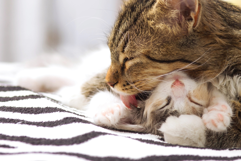 В течение первых трех недель жизни котенку в вопросах туалета помогает его мама-кошка. Это происходит следующим образом: во время вылизывания котят шершавый язык матери массирует животики малышей, что приводит к раздражению сфинктеров ануса и мочевого канала. В результате таких действий сфинктеры расслабляются, и котенок может справить нужду. Все выделения мама-кошка слизывает, что объясняет, почему владельцы новорожденных котят не могут сразу заметить «следы» их деятельности.