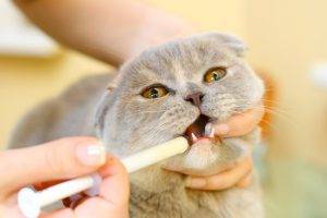 Растворенное лекарство нужно набрать в шприц. Для этого лучше всего подойдут шприцы объемом 5 или 10 мл. Содержимое шприца, равномерно нажимая на поршень, вводят питомцу, располагая шприц у беззубого края челюсти. При этом важно следить за тем, чтобы кошка проглатывала каждую порцию, и только после этого давать следующую. Для удобства можно обернуть животное в одеяло или полотенце, чтобы оно не вырывалося.