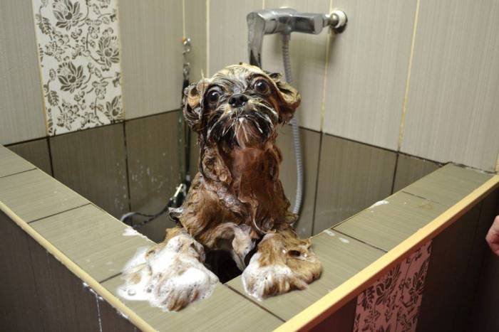 - Водные процедуры. Регулярное купание собаки необходимо, и для домашних животных достаточно мыть их от одного до трёх раз в месяц, в зависимости от степени загрязнённости. Кроме того, важно мыть питомца частично (лапы, живот, мордочка и область под хвостом) после каждой прогулки.