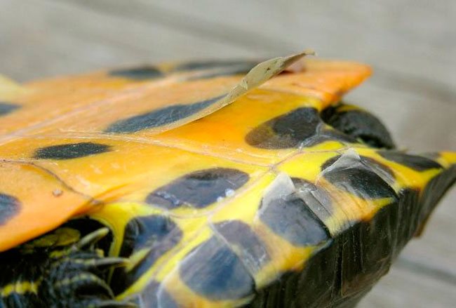 Периодически красноухие черепахи линяют, верхние слои панциря отслаиваются и отмирают, падая на дно террариума. Этот процесс не требует дополнительного вмешательства со стороны владельца, достаточно просто следить за содержанием в рационе кальция и витаминов.