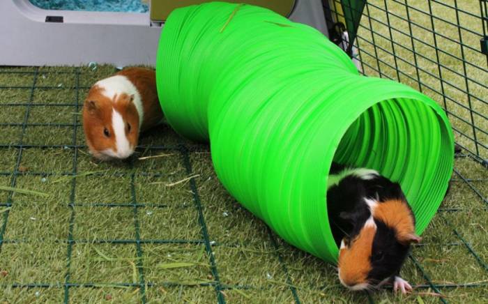 Свинки не любят скучать, поэтому отличным аксессуаром будет сплошная лесенка (без отверстий) или мостик, на котором можно следить за происходящим. Также можно разместить в клетке или вольере большой туннель в качестве игрушки или лакомства.