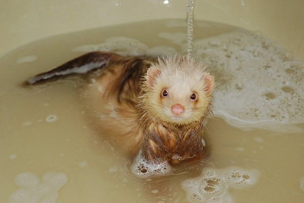 Купание хорька не является обязательной процедурой, однако из-за своей природной любознательности эти озорники часто оказываются в самых грязных и труднодоступных местах, где скапливается много грязи и паутины.