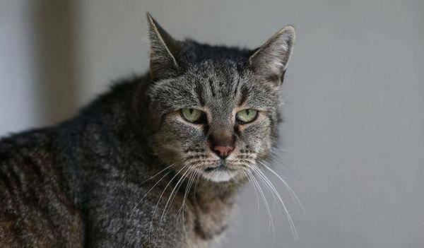 В старости усы у кошек направлены вниз. Если окрас животного однотонный, будет заметно, как постепенно седеют усы. Чем больше у кота седых усов, тем он старше.